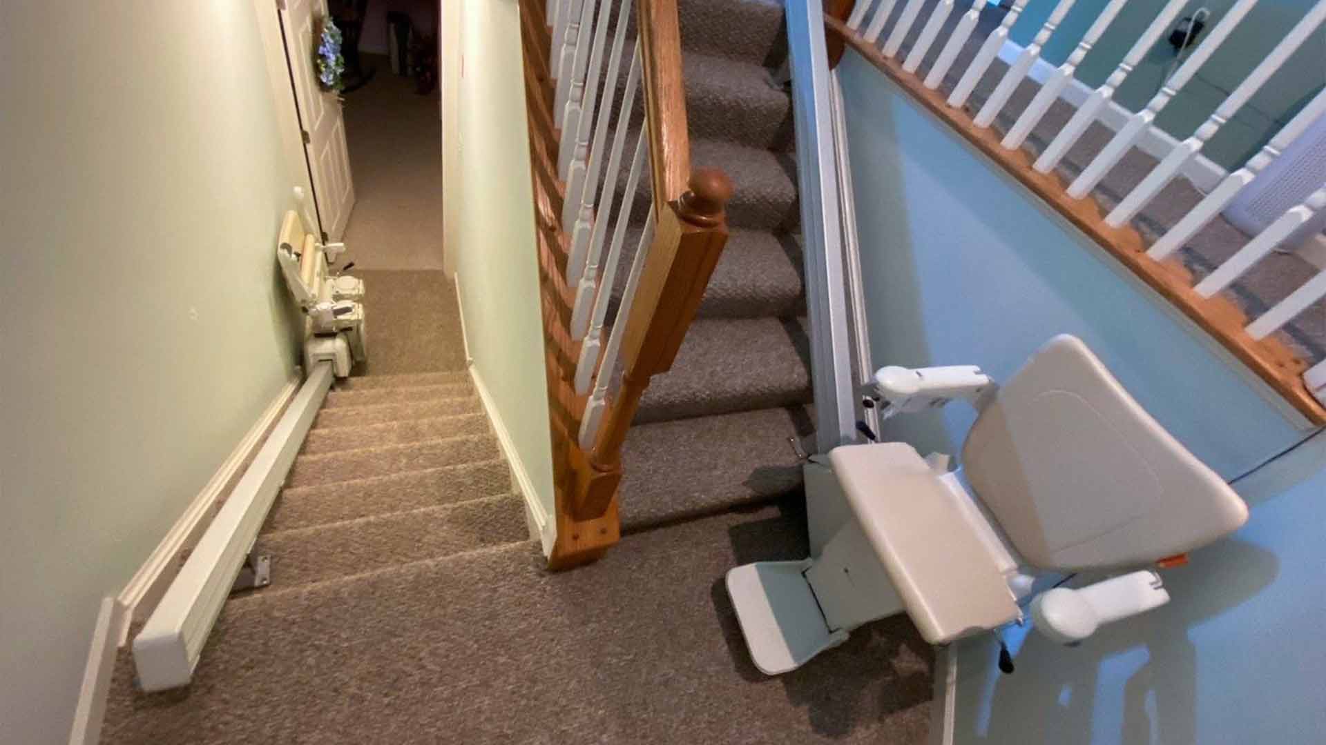 Chairlift untuk tangga yang berputar, menggunakan 2 unit chair lift, di mana akan ada transite di setiap landasan tangga untuk mencapai setiap lantai, Anda perlu bergerak dan berjalan sedikit saat melewati setiap kursi.